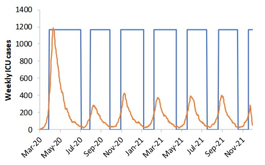 Figure 4: Illustration of adaptive triggering of suppression strategies in GB, a policy of all four interventions considered, an “on” trigger of 100 ICU cases in a week and an “off” trigger of 50 ICU cases. The policy is in force approximate 2/3 of the time. Only social distancing and school/university closure are triggered; other policies remain in force throughout. Weekly ICU incidence is shown in orange, policy triggering in blue.