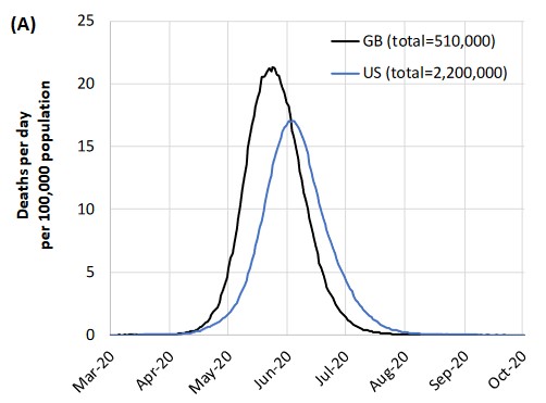 Unmitigated epidemic scenarios for GB and the US. Projected deaths per day per 100,000 population in GB and US. — This is for an uncontrolled epidemic.