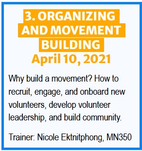 CART closed captioning will be provided at each training, and recordings and training materials will be available below after each training. Delivered by experienced trainers from local 350 groups in collaboration with 350.org.