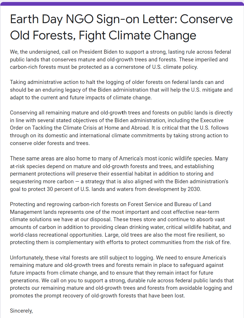 OCA signed on to this letter, which was sent to the White House, USFS, and BLM. This letter is being led by NRDC, Earthjustice, Environment America, Sierra Club, Southern Environmental Law Center, Center for Biological Diversity, Standing Trees, Wild Heritage, and Oregon Wild.